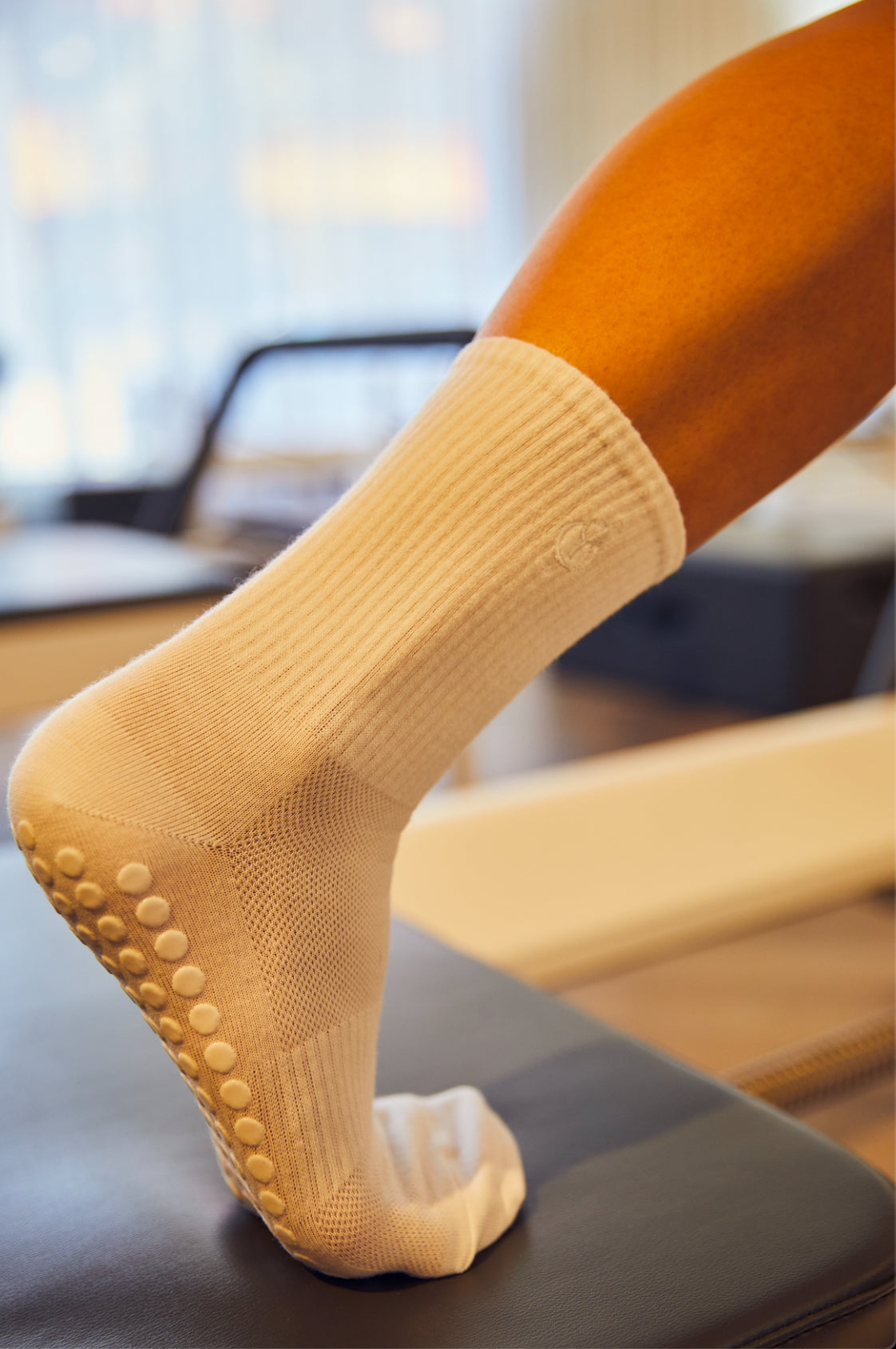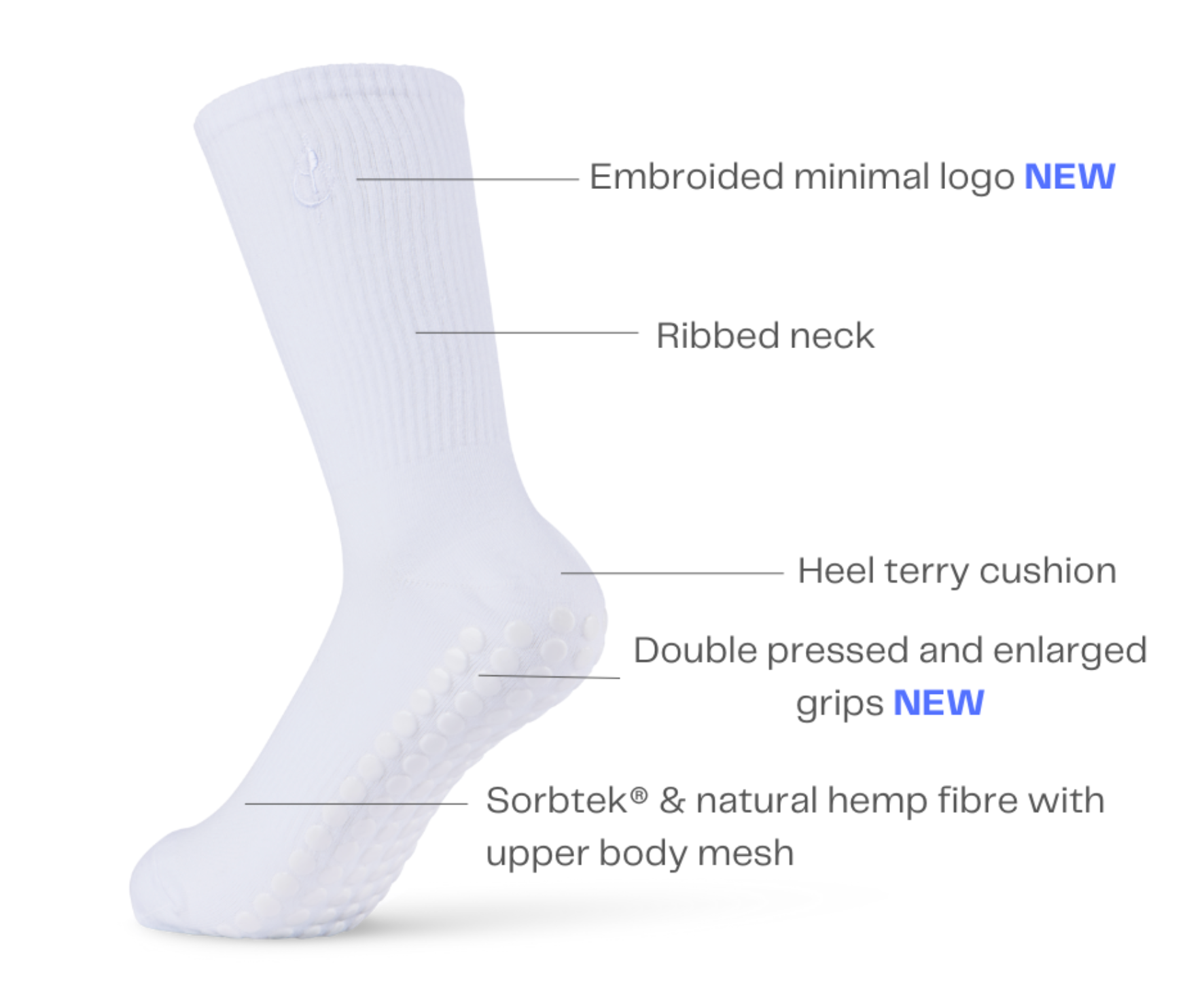 Signature classic white grip socks made with natural hemp and recycled Sorbtek® for sweat resistance for Pilates and fitness.